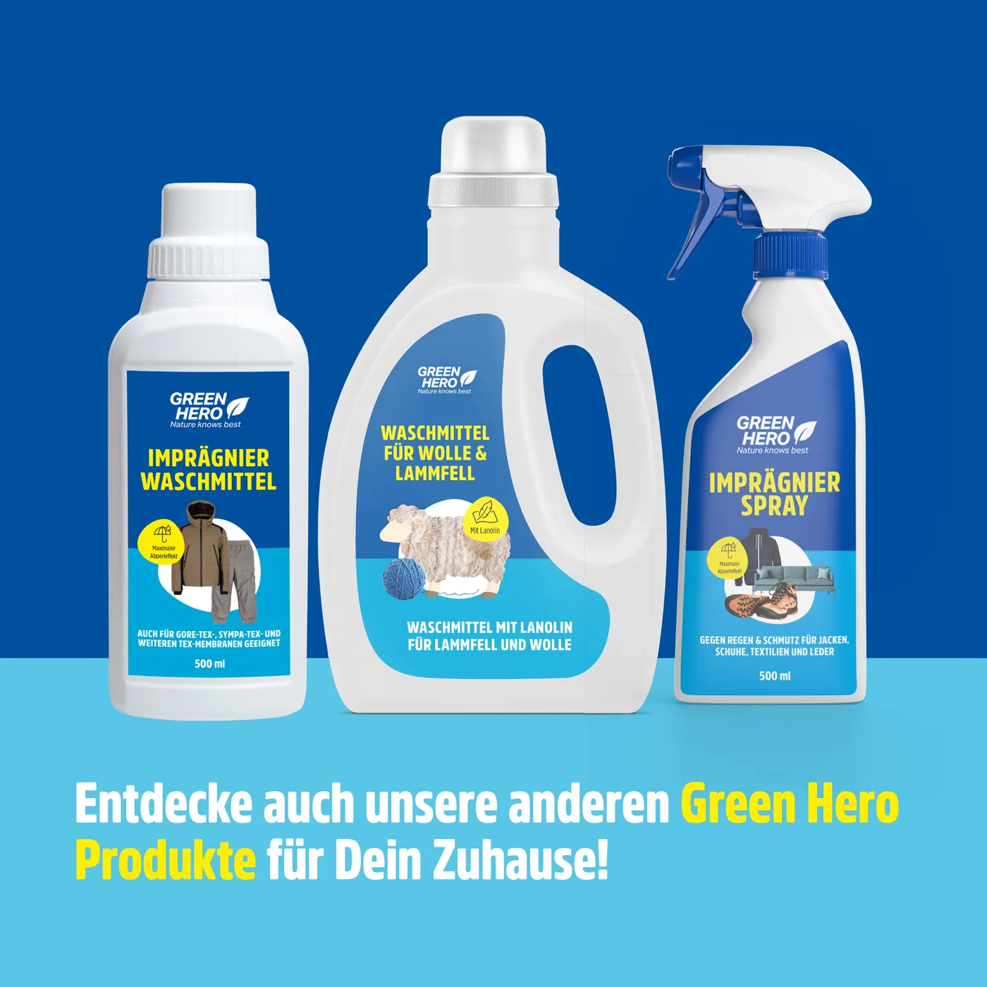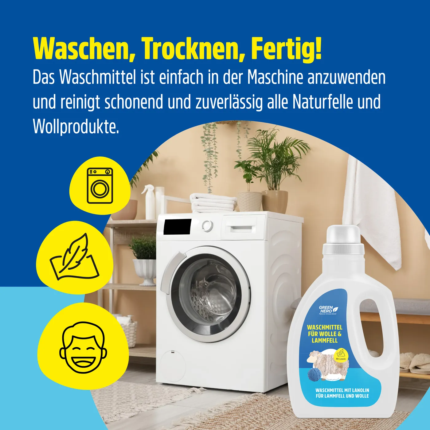 Das GreenHero Lammfell-Waschmittel ist ein spezielles Pflegewaschmittel für Lammfell, Wolle und andere Naturhaartextilien. Es wäscht sanft und sicher, pflegt die Fasern flauschig-weich und schont dabei die Farben. Durch den enthaltenen Lanolin-Pflegebalsam und die speziellen Pflegestoffe bleibt die Wolle auch bei längerer Nutzung elastisch und angenehm weich. Das Waschmittel arbeitet im pH-neutralen Bereich, erhält die typische Frische und kommt ohne optische Aufheller und Bleichmittel aus.