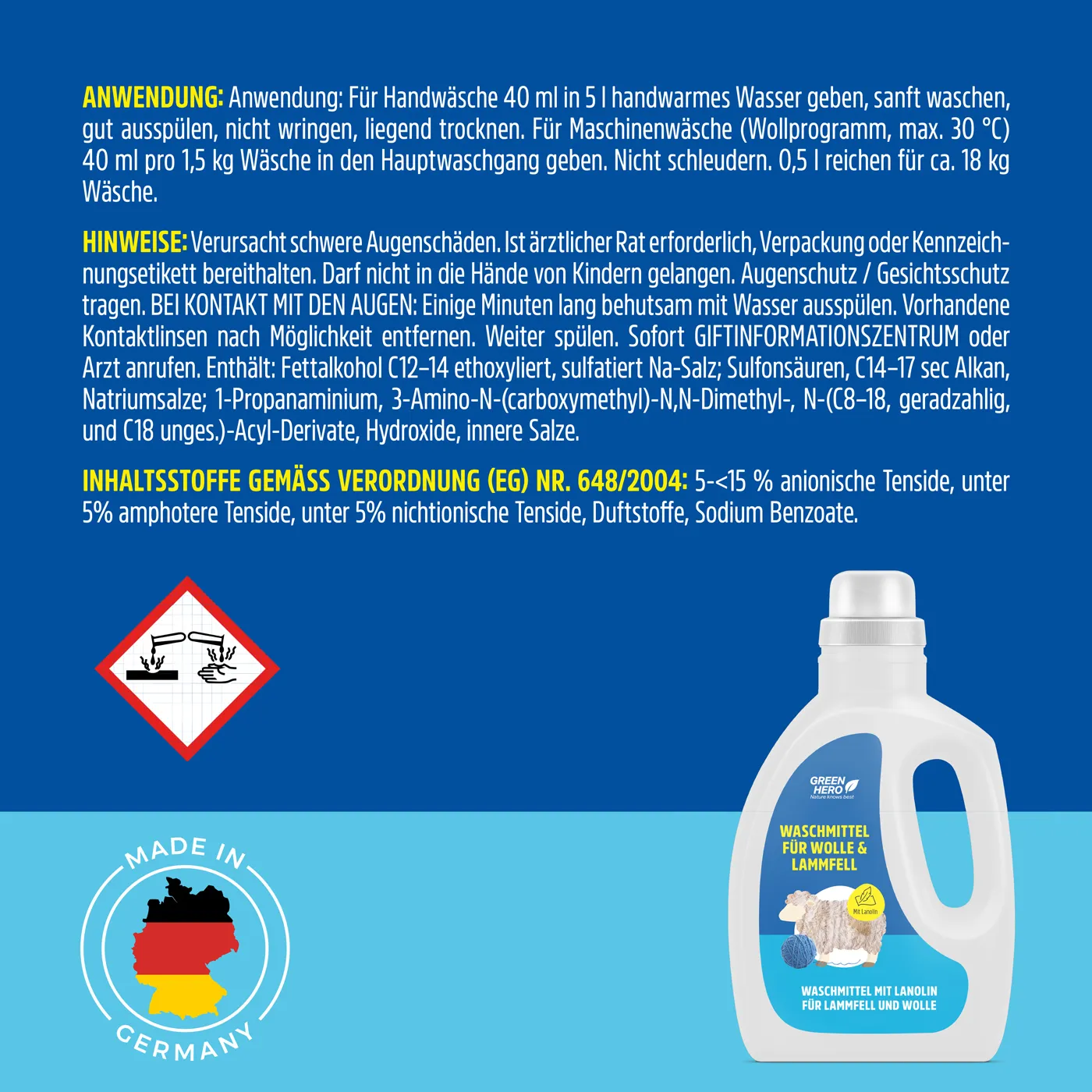 Das GreenHero Lammfell-Waschmittel ist als Spezial-Wollpflegewaschmittel entwickelt und damit gezielt auf die Bedürfnisse von Wolle und anderen Naturhaartextilien abgestimmt. Es verbindet eine sichere, gründliche und schonende Waschkraft mit besten Pflegeeigenschaften im pH-neutralen Waschbereich. Durch die spezielle Wirkstoff-Kombination aus natürlichen Pflegestoffen mit Lanolin bleibt die Wolle auch nach langer Zeit natürlich elastisch und sympathisch weich, die Farben werden geschont, und die typische, klare Frische bleibt erhalten.