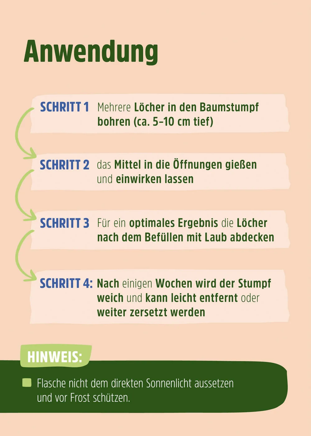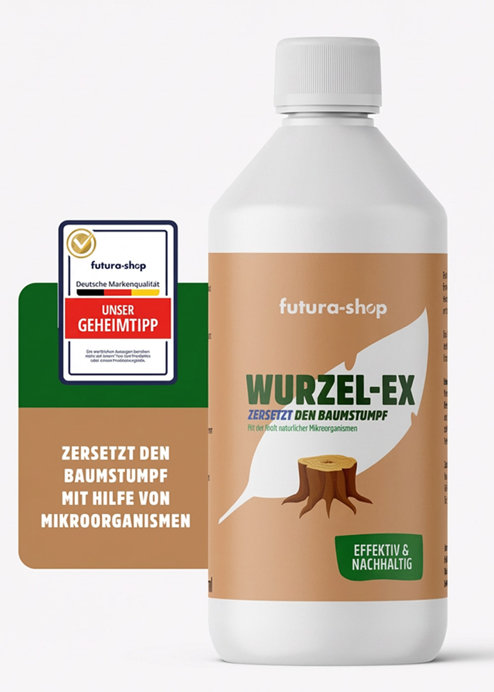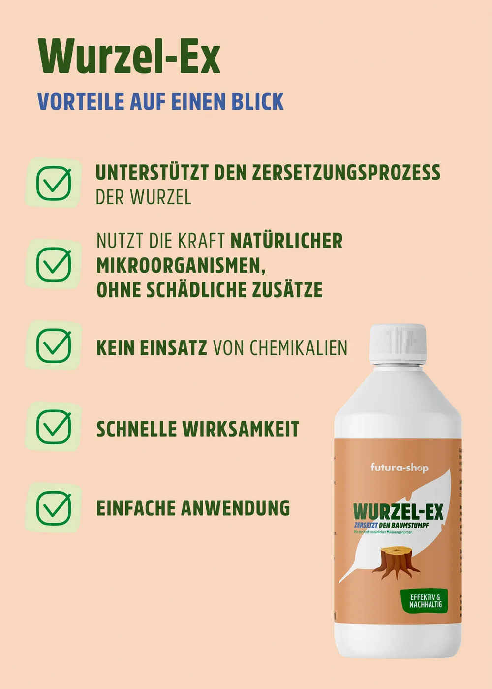 Wurzel Ex ist zu 100 % umweltfreundlich und nutzt die Kraft natürlicher Mikroorganismen, um den Baumstumpf sowie die Wurzeln unter der Erde schonend abzubauen. Der natürliche Zersetzungsprozess wird unterstützt und beschleunigt, ohne dass dabei schädliche Chemikalien zum Einsatz kommen. Durch die natürliche Zusammensetzung ist das Mittel vollkommen unbedenklich für Natur, Mensch und Tier, sodass Hund, Katze und Co. weiterhin durch den Garten toben können; jedoch ist es keineswegs zum Verzehr geeignet und sollte deshalb außer Reichweite von Kindern aufbewahrt werden. Achte zudem darauf, die Flasche keinem direkten Sonnenlicht auszusetzen und das Wurzel Ex-Mittel vor Frost zu schützen, damit es seine Effektivität behält.